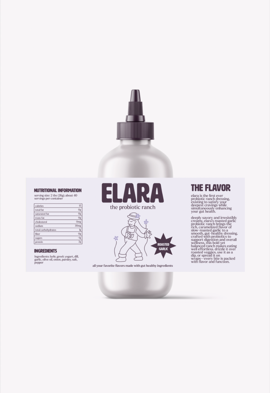 Elara is a project creating a gut-healthy ranch dressing that maintains bold flavors with health benefits. Elara emphasis on sustainable packaging, modern design, and promoting a balanced lifestyle through brand storytelling. This project is not only about redefining ranch dressing as a catalyst for healthier eating and living, but also about creating a sense of community by donating fresh foods with every purchase.